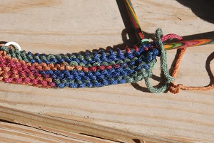 So I’m knitting again. There’s a group in central Texas called The Linus Connection that distributes hand-made blankets for children in crisis situations. I’m working on a blanket. Blankets for this group must be machine washable/dryable, and synthetic yarn if knitted or crocheted. So I’m doing research, perforce, because in the old days (!!) I knit only with wool and only on straight needles (knitting round on four double-pointed needles.) And I never used variegated colors. Now I’m working with synthetic yarn, variegated colors, and a circular (cable) needle. My hands like the movements. My brain is fascinated with what I’ve forgotten, figuring out how to fix mistakes, and the new stuff–the yarn, the effect of different colored dyes on the same yarn (the blue stretches have one “feel” and behavior; the green, red, orange, gold have different feels and behaviors.)